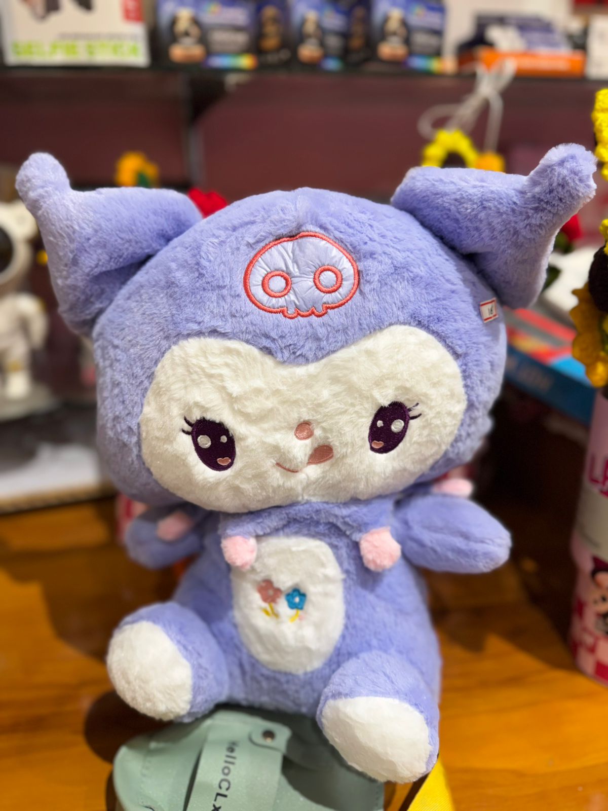 Lavender Kuromi plush with skull emblem and soft fabric.