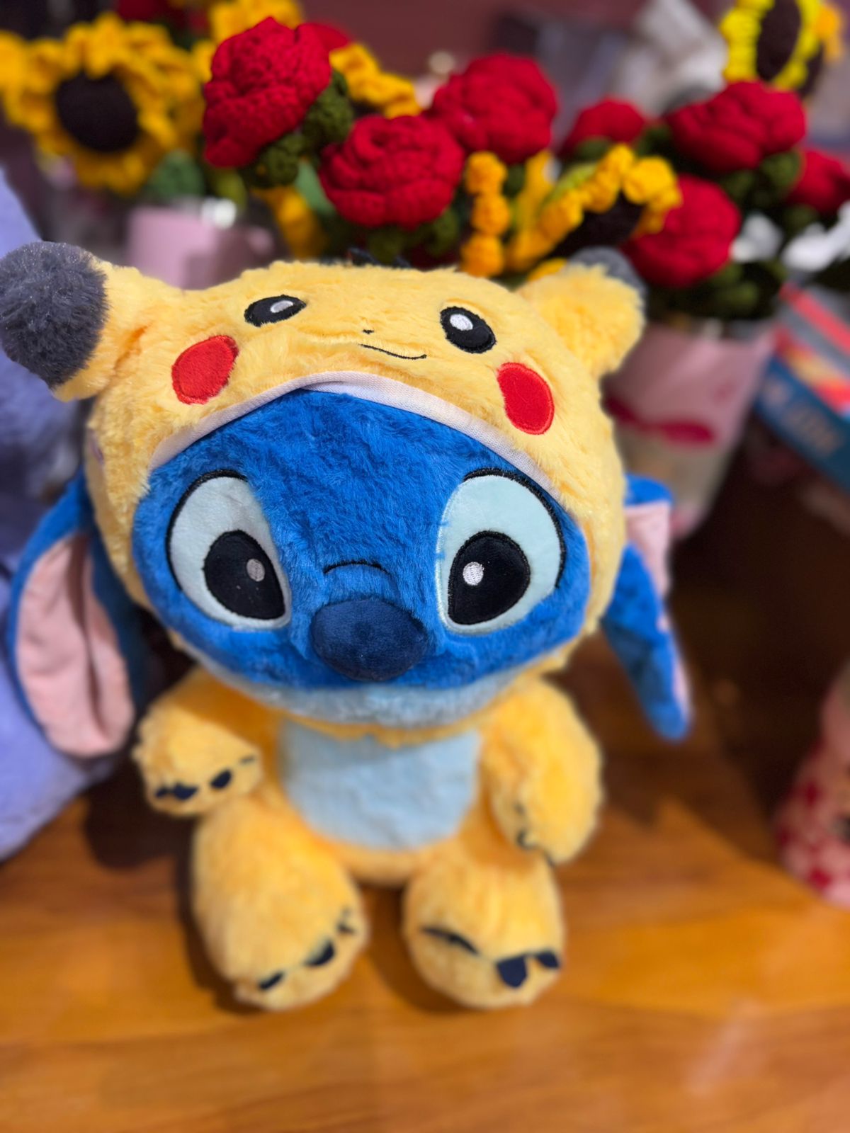 Stitch plush dressed in Pikachu costume (Stitchachu style).